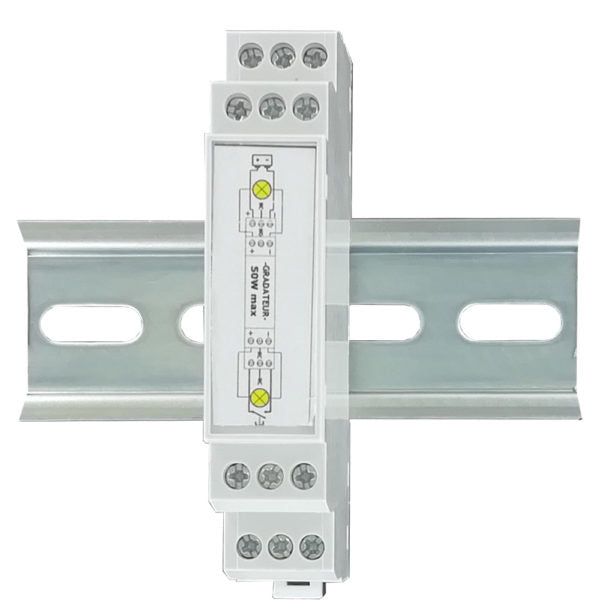 Dimmer for montering på skinne (DIN) med mykstart og minnefunksjon slik at den «husker» siste lysstyrke. Kan brukes både på LED og halogen (NB: max 50W).