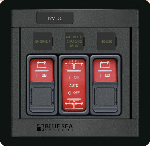 Panel for system med to batteriladerer og automatisk bryter for lader.