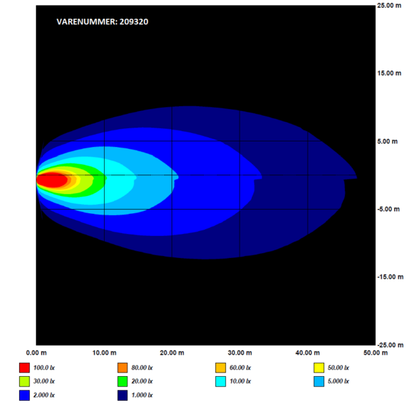 - Lysstråle: L: 60 m B: 20m ved 1 lux
