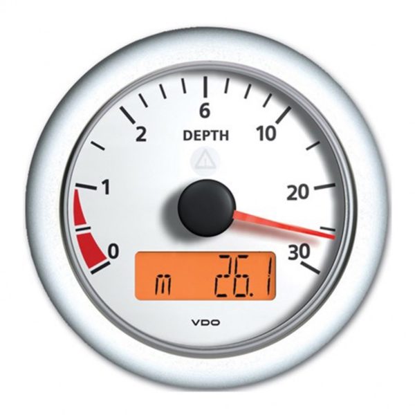 85mm Dybdemåler for bruk med NMEA0183 transducer. Viser dybde 0-30m på skiven og evt. i display. Kan også vise vanntemperatur om sensor har innbygget tempsensor. Viser også klokke og voltmeter i display.