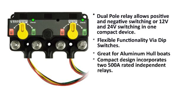 2 polet fjernstyrt batteribryter fra amerikanske Egis for opp til 500A kontinuerlig strømtrekk. Dette er en fleksibel batteribryter som har flere funksjoner, ikke bare kan den brukes for 2 polet brudd (perfekt til aluminiumsbåter), men den kan også brukes til å bryte to forskjellige batteribanker, der det ene batteriet kan være 12V og den andre 24V f.eks.